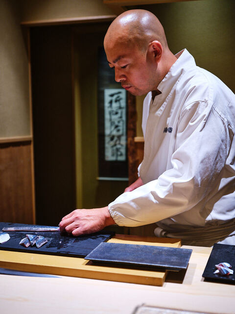 大将・高梨 悠真さんのカウンターは、緊張感と温かみが共存する特別な空間。厳格な眼差しで常に全体を見渡しながらも、客一人ひとりに気を配り、落ち着いた所作で鮨を紡ぎます。