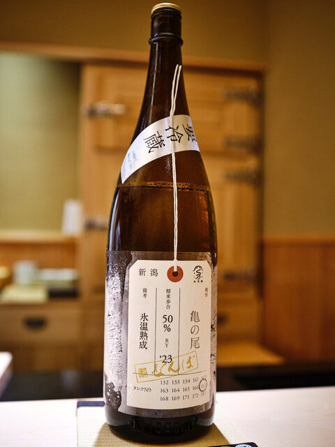 亀の尾(新潟)純米大吟醸。透明感と酸のバランスが、白身の爽やかさを引き立てました。