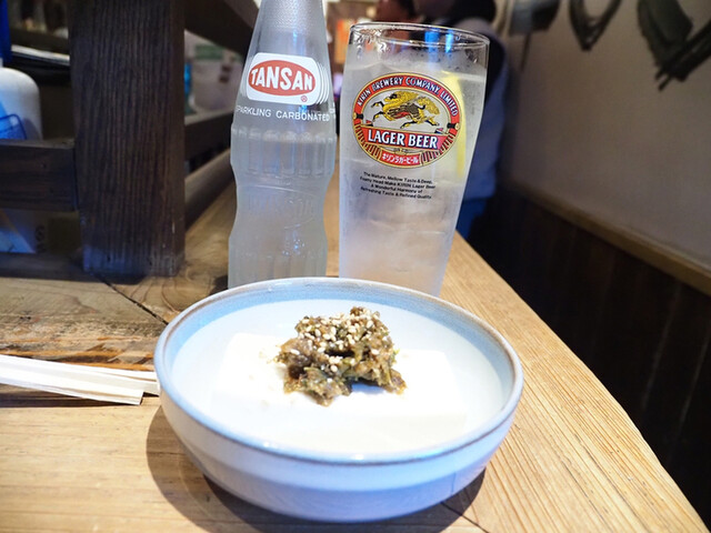 旬のへべ酢酎ハイにはたぬきやっこで攻める。当店の豆腐の美味さは食べた人だけの特権!