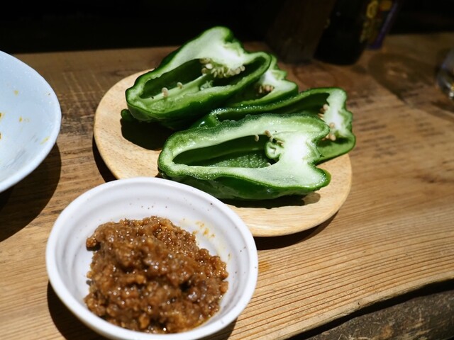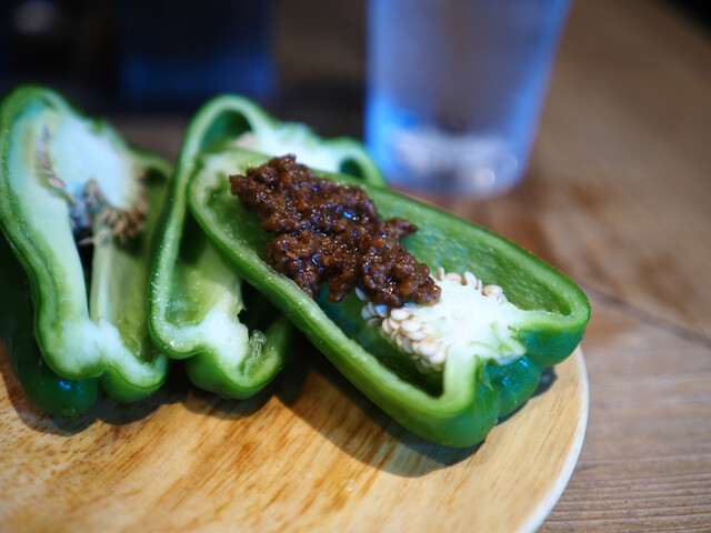 肉味噌肉厚ピーマン種付きをオーダー、肉味噌の美味さは判っているけど、ピーマンとの相性の良さを再確認!胡瓜、キャベツともイイけど、肉厚ピーマンはもっと良かった!