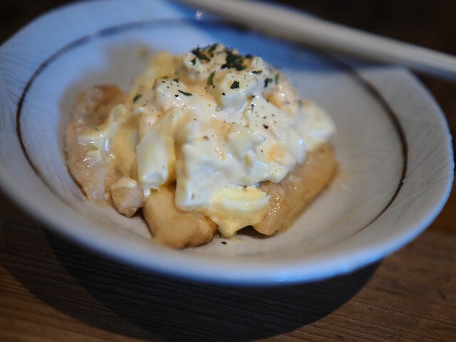 鶏肉ポン酢タルタルソース、これがブタキムをセカンドに追いやってしまう旨味。ムネ肉に片栗粉かなぁ?何とも言えない食感がプラスされた鶏肉にポン酢とプリタツのタルタルが魂を鷲掴み!んめぇZ!