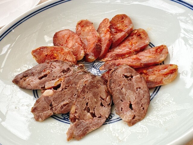 そしてここならではの湯引きした内蔵の炒め、茎レタスやネギと鮮度最高のやわらかなコリコリ感が美味すぎる! 味噌と麹で作った酢豚のスペアリブもクセになる。メインは象徴的といえる参鶏湯のような丸ごとスープの薬膳鍋に土鍋のお米を腹パンで。