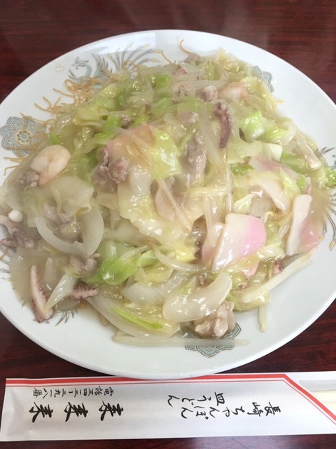 細麺の皿うどん。パリパリの細い揚げ麺に野菜たっぷりの餡が絡まって実に美味しい。