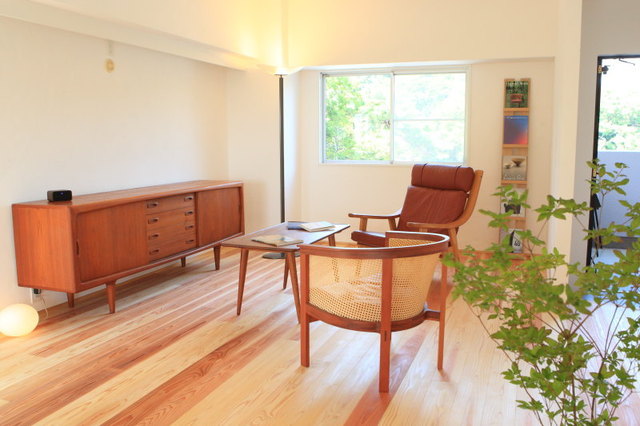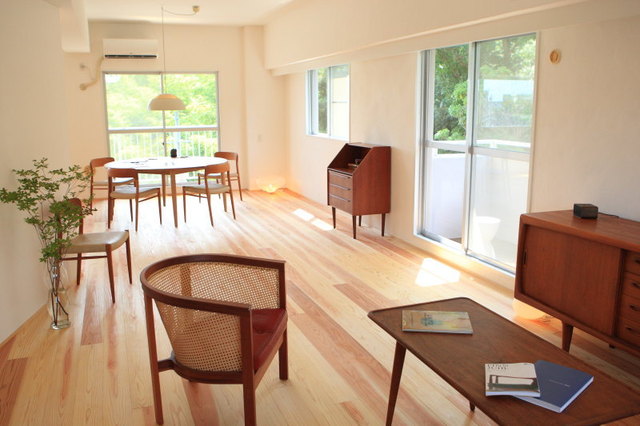 四ツ池公園に隣接するタワー型賃貸マンション「パークビュー四ツ池」のリノベーション企画第1弾が完成いたしました!この度、モデルルームを一般公開させていただく内覧会として初日が無事に終了いたしましたことをご報告させていただきます。こちらの賃貸マンションは、四ツ池公園という恵まれた自然環境を活かし健康をテーマにリノベーション。仕切空間を取り除き、余分なものを削ぎ落とし、シンプルなデザインで飽きのこない開放的な部屋づくりを目指し、四ツ池公園の自然に調和できるような空間づくりを追求しています。賃貸マンションでは珍しい天竜杉の無垢材を贅沢に用い、裸足で感じる木々の温もりを体感していただきます。夏はひんやりと涼しく、冬は暖かく、気候ごとに本物の木が持つ風合いと機能を楽しむ暮らしを提供。リビングスペースは、キッチンと連動させ、ホームパーティなど自宅でイベントが開催しやすい広々としたパブリックスペースとしてご利用いただけます。通常住まうことを想定しましても、キッチンに立つ時間が長い主婦のために、家族が寛ぐリビングが家事をしながら見渡せる空間づくりをするために、新設した箱壁には斜めのラインを施したりと視界を遮らないように工夫しています。開放的な空間や自然素材を用いることで感じ取るストレスフリーの生活環境を念頭に置いてフルリノベーションさせていただきました♪