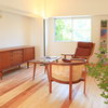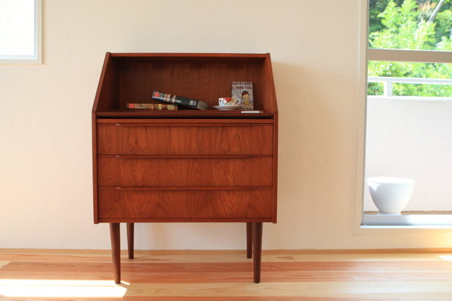 1950-60年代のビンテージのライティングビューローには、フランク・ロイド・ライトの洋書と帝国ホテルがフランク・ロイド・ライトにデザインを依頼したコーヒーカップ、当時のメーカーと同じくして「Noritake ノリタケ」の復刻版をコーディネート。世界的に評価されているポップアート作家である奈良 美智(ならよしとも)氏の絵葉書本もお茶目に添えて♪