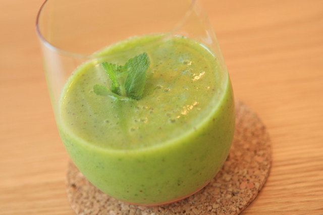 材料(2人分):小松菜2束、パセリひとつまみ、マンゴー(小さくカットされた冷凍もの)6個、バナナ1本、リンゴ1/4個、梨1/4個、キウイフルーツ1個、国産蜂蜜小さじ2(無くても可)、美味しい水200cc。(グリーンスムージーについて)