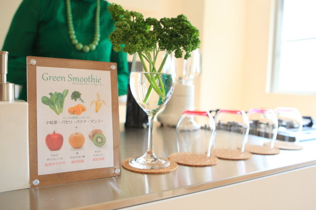 ご来場者の皆様には、毎朝飲んでいる特製グリーンスムージーをご用意させていただきました。ベースの野菜に、栄養価の高い緑葉野菜の小松菜とパセリを基本とし、緑葉のえぐみを抑えるためマンゴーとバナナを使い、そのベースに血液サラサラ効果の高いポリフェノールが含まれているリンゴと疲労回復に適し夏終わりのバテ防止にアスパラギン酸を含む梨、そしてビタミンCたっぷりで美肌効果に適しているキウイフルーツをミックスし、最強の健康ドリンク!皆様にご好評いただく中、最初は野菜の色に戸惑っていた小さなお子様も、一口飲んでみると、おかわりを望まれるほど!(嬉)お母様にはレシピも伝授させていただきましたが、手軽なスムージーをとても喜んでいただきました♪