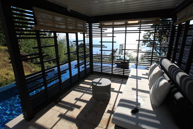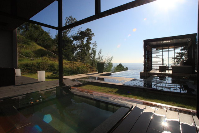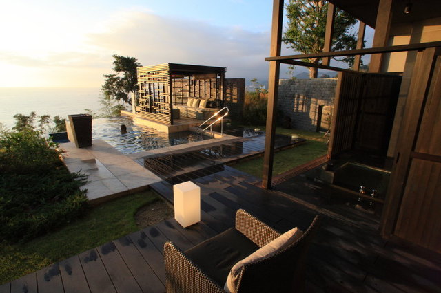 相模湾を一面贅沢に眺望できる全室。オリエンタルなアジアンテイストを盛り込んだ落ち着いたテイストのインテリア。1年中、四季を通して感じることのできる日本の素晴らしさ。こちらのように屋根付きテラスなら、紫外線が苦手なマダムも文句なしですね♪