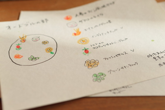 映里ちゃんが描いてくれた可愛いイラストの盛り付け指示に従い、白いお皿に前菜を8種類盛り込んでいきます♪
