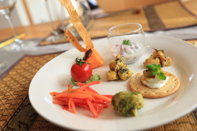 ザクロのライタ(ヨーグルトのサラダ)、フィッシュピクルス(とんぼ鮪とサゴシ)、インディアンカナッペ(水切りヨーグルトとレモンのピクルス)、グリーンチキンティッカ、トマトon ココナッツチャトニのディップ、人参のクミン風サラダ、柿とタマリンドチャトニ パパドを添え(豆煎餅)て。チャトニとは、いわゆるチャツネのことですが、日本でお馴染みの甘いジャムの様なものとは異なり、スパイシーでフレッシュなソースでディップにしたり、いろいろな料理やカレーにも混ぜて食べるようです。クミンを使ったサラダは、強い香りとほろ苦さが癖になりそうです。殆どが初めていただく味わいのものばかりですが、ティッカは、ヨーグルトと香辛料に漬け込んだ鶏肉を窯で焼いたもので、こちらは馴染みのある料理となります。一番のお気に入りは、スパイスのオイルに漬けて作るフィッシュピクルス!これはビールの当てに最適です!カレーリーフという、オオバゲッキツ(大葉月橘)、またはナンヨウザンショウ(南洋山椒)の葉を良く使われていましたが、この葉の香りがまた食欲をそそる葉でした。ザクロのヨーグルトもとっても美味しかったですね♪