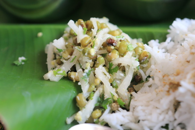 緑豆を発芽させて茹でたものを大根と和えたカルナータカ州のサラダ、クスンブリ。さっぱりとしたサラダです♪