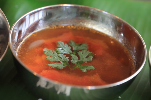 ラッサムとは、南インドで日常的に飲まれているスープの1つで、トマト、タマリンドなどを黒胡椒やニンニクで味付けして煮たもので、辛味と酸味が強いのが特徴です。酸味が得意な人に喜ばれるスープで、こちらもとてもヘルシー♪