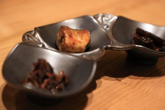 先付け「蜂の子の佃煮、鰯の甘露煮、ハツと蒟蒻の赤味噌煮込み」