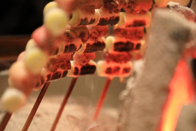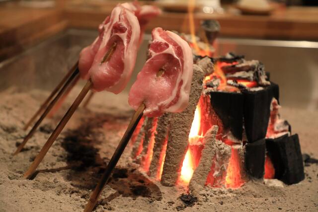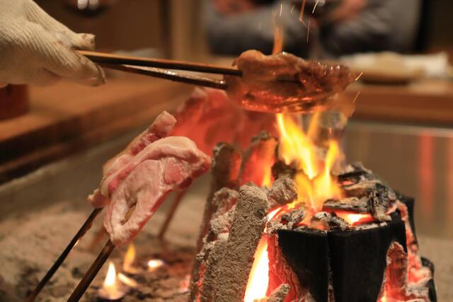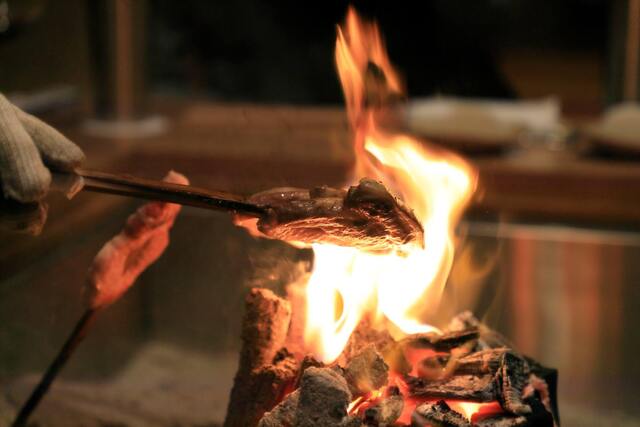 最後の仕上げは炭火の上で炙りを入れます。脂が滴ることで火が上がり、見ているこちらもワクワクしてしまいます!