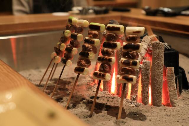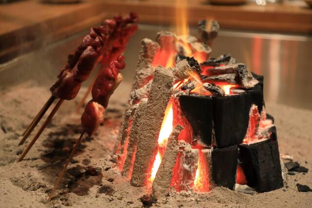 串を刺す位置と角度を微妙に調整しながら決め打ちし、焼き進めると鴨の脂が葱を通って滴り落ちる瞬間に、ジュッと美味しい音を響かせながら、良い色に仕上がっていきます!