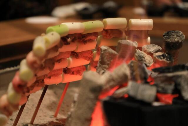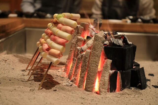 囲炉裏に用意された炭の火おこしは既に準備万端で、食材を待ち構えながら、私たちの冷えた体をも優しくじんわりと温めてくれます!炭は2種類の異なる炭を利用し、その組み立て方も独特です。円陣の中心に置いているのが備長炭で、周りには火が回りやすいアオガシを置いています。アオガシは香り付けの意味もあり、炭の良い香りを食材に閉じ込め堪能することができます!