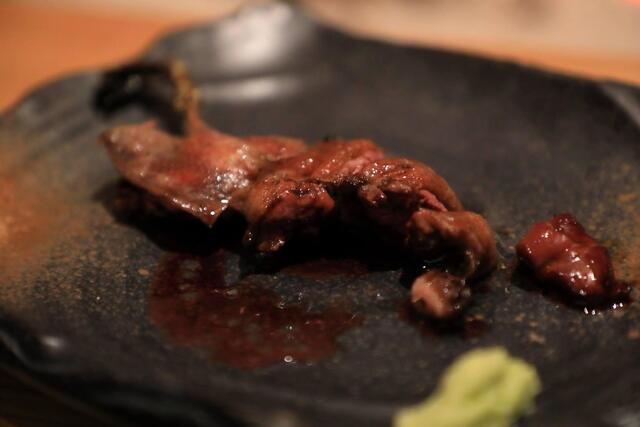 先端にハツを乗せた一羽を半身にした「仔鴨」。仔鴨はマガモの小さい鴨、鴨の子供と思われている方も少なくないと思いますが、実は全くの別品種で仔鴨は「仔鴨」という鴨の名前とのことで、「鴨界では一番美味しいと思いますよ!」と剛之(Masashi)氏。