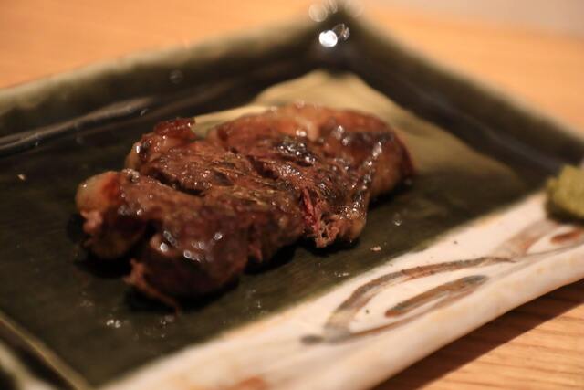 秘伝の漬けダレを身に纏い、艶やかに仕上がった「仔鴨の半身」!豪快に足を拝借し、かぶり付きます!こちらには、香り爽やかな本山葵を添えていただきます。冬は優しい伊豆の本山葵を、夏は刺激的な安曇野の本山葵を使用されています!