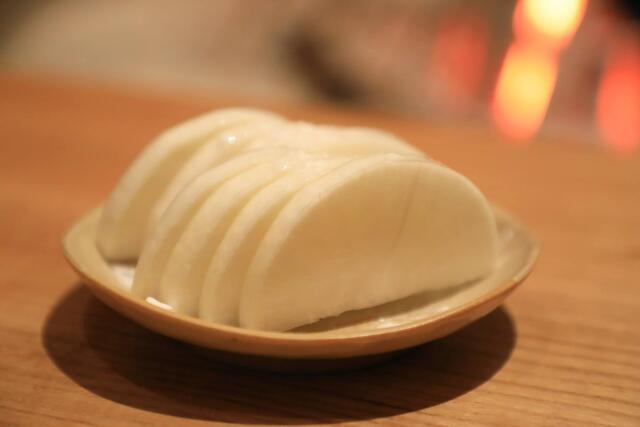 地場の大根の皮を剥き半月切りにし、塩をかけただけのシンプルなサラダ。肉続きのジビエとなるため、箸休め的な存在。