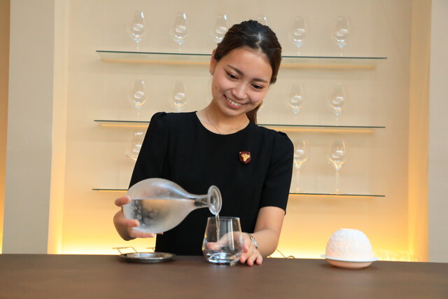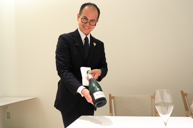 ワインはフルコース料理に合わせたペアリングを、Standard(7glass)¥13,750、半量となるHalf(7glass)¥10,450、Short(3glass)¥7,920の3コースから用意しており、Sommelierの高鍬未翔(Misho Takakuwa)さんによる料理に寄り添った絶妙なマリアージュが味わえます。高鍬さんは、第4回「J.S.A.ソムリエ・スカラシップ」の優秀賞を受賞されており、名古屋の老舗フレンチレストラン「Les Mirepoix(レ・ミルポア)」をご実家に持つサラブレッド。ご実家にてキャリアをスタートさせた後、「マンダリン オリエンタル 東京」ではザ・セラー ソムリエ スーパーバイザーとして活躍。ソフトでスマートなホスピタリティ溢れる接客でありながらも、時折見せる笑顔がとてもキュートでお茶目なお人柄も好感が持てます。そんな彼に信頼を置く葛原シェフは、「前任から引き継いだワインを土台に、高鍬色を入れながら日本一の品揃えで価格も良心的と言われる日を目指します」と宣言されるほど。
