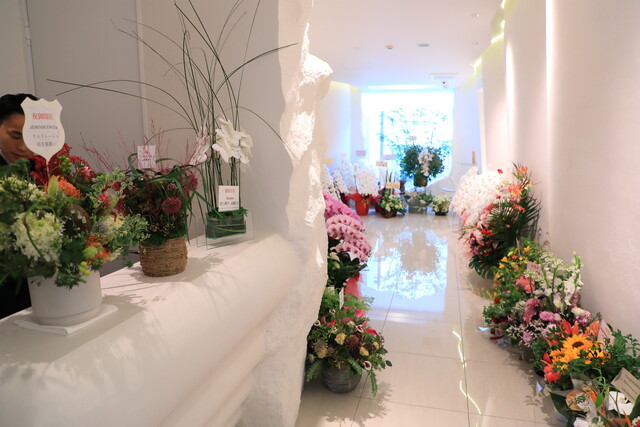 新店舗の構想段階から携わっていたこともあり、待ちに待ったオープン日。葛原シェフの人望を表すかのように、友人知人仲間たちからのお祝いに溢れ彩られるエントランス。私たちもディナータイムでお祝いに駆け付けることができました。ウェイティングブースでは、「Louis Poulsen(ルイス・ポールセン)」Wohlert(ウォラート)のペンダントライトから注がれる柔らかな灯りでお出迎え。