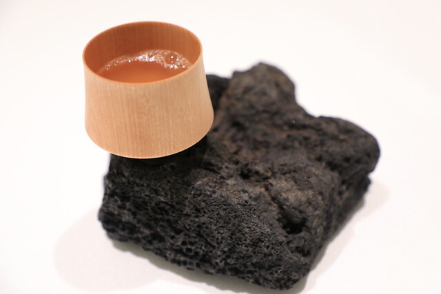 コースは第三章に突入し、お次も旧店舗時代から提供している「天岩戸」。葛原シェフが尊敬する和食屋の大将が「京都は水がとにかくいい」と話されていたことを機に、東海地方の湧水に興味を持ち、調べ上げたところ、伊勢の御神水の存在を知ります。環境省選定の名水百選にも選出されている伊勢志摩の国立公園の御神水「恵利原の水穴(天の岩戸)」の許可を取り、月に一、二度汲みに出向かれています。日本神話の中でも有名な一節「天照大神」の岩戸隠れの神話に登場する神秘的な洞窟。金沢の「secca(雪花)」にて、御神水の湧水をイメージし、神の盃として作られた器に洞窟岩を模した土台をオーダー製作し、装い新たに登場です!