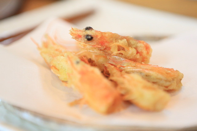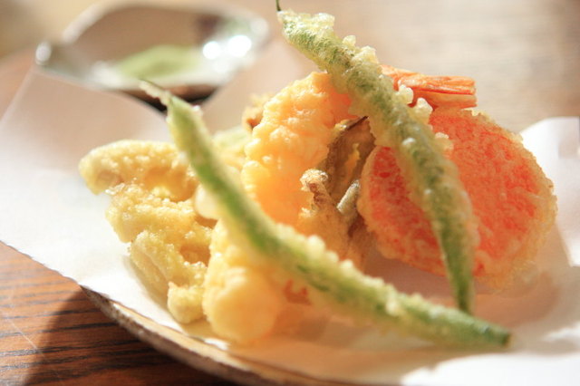 海老、隠元豆、人参、蓮根、舞茸。奥様の三枝子さんが揚げてくれる天ぷらはサクッとした音と共に素材の旨味を味わえる状態に仕上がっています♪