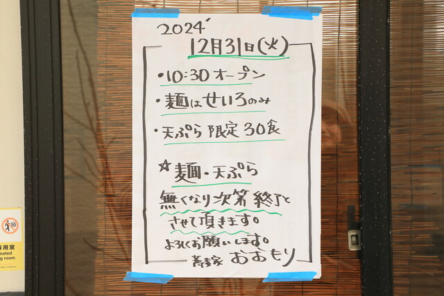 大晦日の営業は通常より時間を早めて朝10:30〜の営業時間となり、蕎麦が売り切れ次第終了となります。今年の朝はゆっくりのスタートだったために、お昼を過ぎた頃に伺い並ぶことになり、外での待ち時間は約1時間ほど。ここ数日の冷えは感じず、暖かな大晦日だったため、外待ちも苦にならずに済みました。遅がけに入店したこともあり、限定30食の「天ぷら」は売り切れとのことで、そばだけをオーダー。