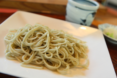 たべくらべは、せいろと挽きぐるみの田舎そばの2種類を食べ比べできます。こちらが皮を取ったせいろ。福井県の丸岡在来を使用し、色鮮やかなグリーンで甘みを感じとても美味しいです♪