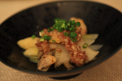 多年生の水生植物で初夏の椀物によく出されるジュンサイを魚介やトマトと共にさっぱりと夏の涼を味わう1品。淡白な味とツルンとした舌触りに粘り気、プルプルとした歯応え、爽やかなソースでいただきます♪