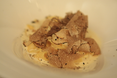 イタリアでは古米ならぬ熟成米がリゾットに向いているとされています。今回は、一年熟成させたお米をリゾットに使用。新米に比べて加熱時の吸収率が高い 熟成米は、ブロードをたっぷりと吸いお米の膨らみ率も高くなります。そして、澱粉質の変化によって表面の細胞膜が強く、お米の粒は破裂したり崩れたりしづらく食感が楽しめ、リゾットに大変向いたお米と言えるようです。サマートリュフを細かく刻み、このままでも十分に香りを楽しめるのですが…。