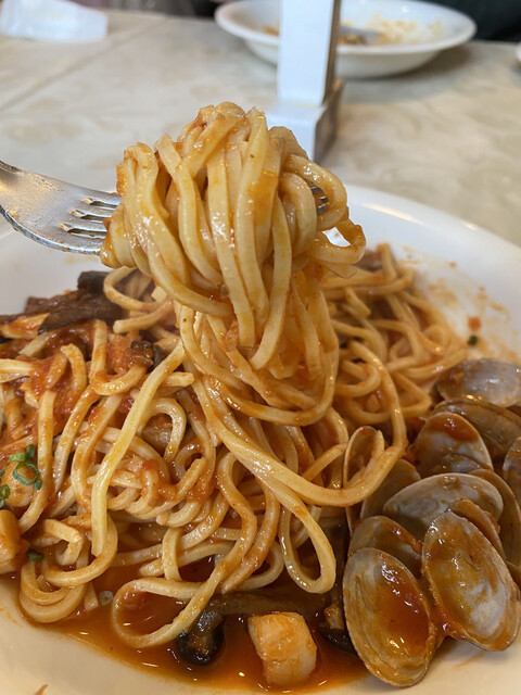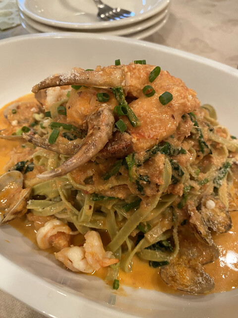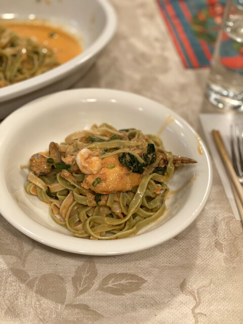 エビ、アサリ、ズッキーニのトマトソースのタリアリーニ