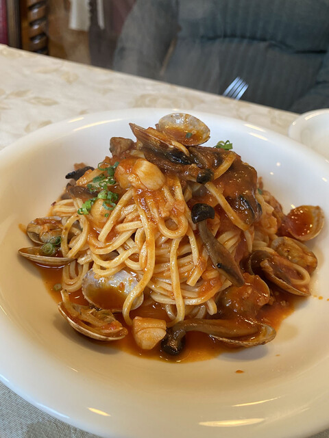 アサリ、エビ、きのこのトマトクリームソース