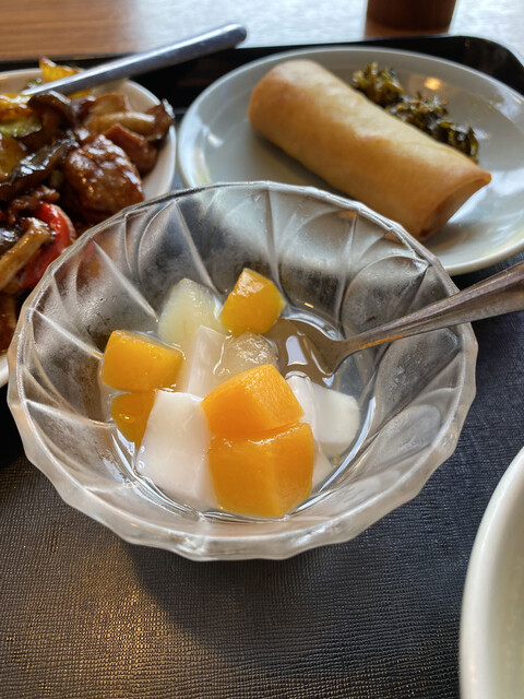 大好きなフクロダケも入っていて、春巻き、コーンのスープ、デザートの杏仁豆腐も付いて