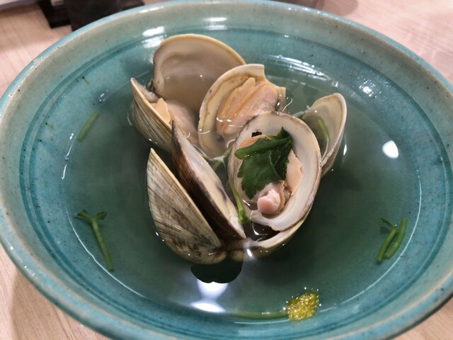 出汁の澄んだ旨味にハマグリの風味が染み出ていて、春らしい一杯。焼きそら豆は香ばしく、甘みがしっかり感じられる仕上がり。
