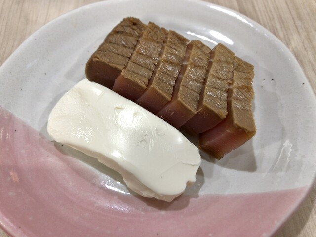 つまみに頼んだ燻製マグロとクリームチーズは、スモーキーな香りと濃厚なチーズの相性が良く、酒の進む一品。