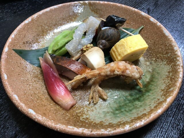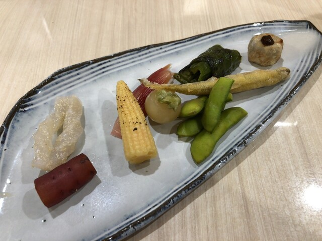 最初に登場したつきだしは、枝豆やヤングコーン、ししとう、稚鮎の天ぷら、銀杏などを少しずつ盛り込んだ前菜盛り。