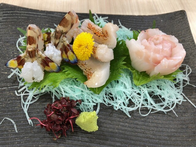 造り盛り合わせは、イシナギや鯖、ホタテ、剣先いかなど多彩な内容。