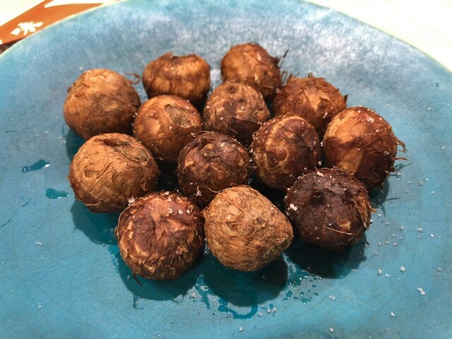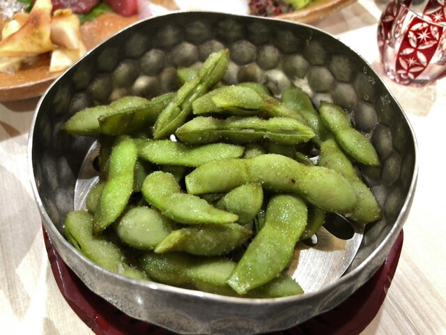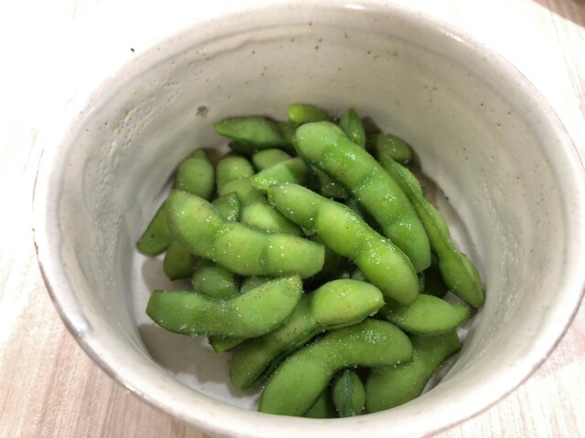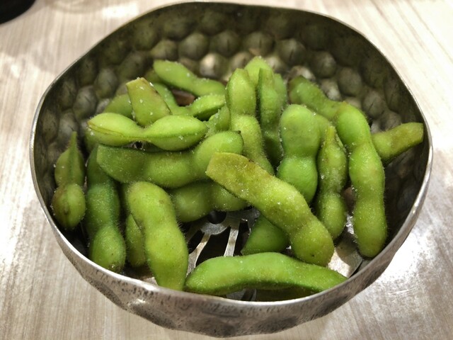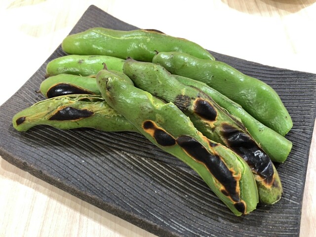 続いて「焼きそら豆」、皮の焼き目から香ばしさが広がり、中はホクホクで甘みが濃い。塩だけで十分な旨さ。