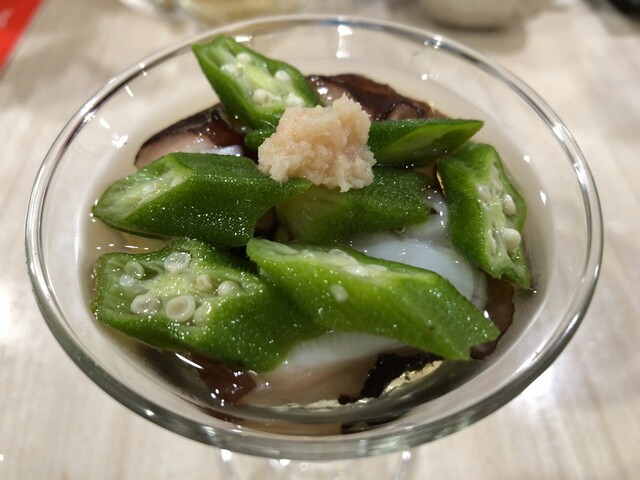 「酢だことオクラの酢の物」は、柔らかい蛸とねばりのあるオクラに、おろし生姜がアクセント。