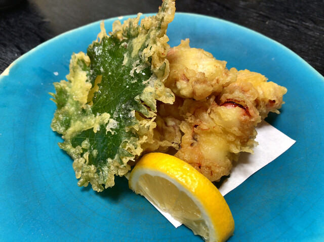 天婦羅盛り合わせは、海老、いか、鱧、蓮根、白ネギ、椎茸、ズッキーニ、茄子、さつまいもに、特大キスを追加。