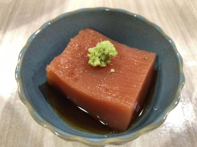 鮮やかな赤色の豆腐は、口に入れるとほんのりトマトの風味が広がり、出汁との相性も良い。