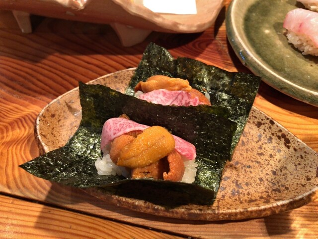 口に入れた瞬間、海のミネラルと牛脂の芳醇な旨みが一体となり、口中を満たしていく贅沢なひと巻き。