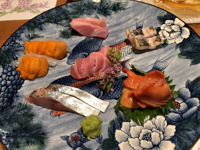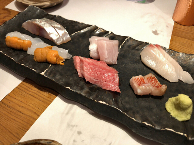 お造り盛り(本まぐろ、千葉 金目鯛炙り、愛媛 まながつお、 太刀魚、淡路 鬼あじ、烏賊、北海道 うに)