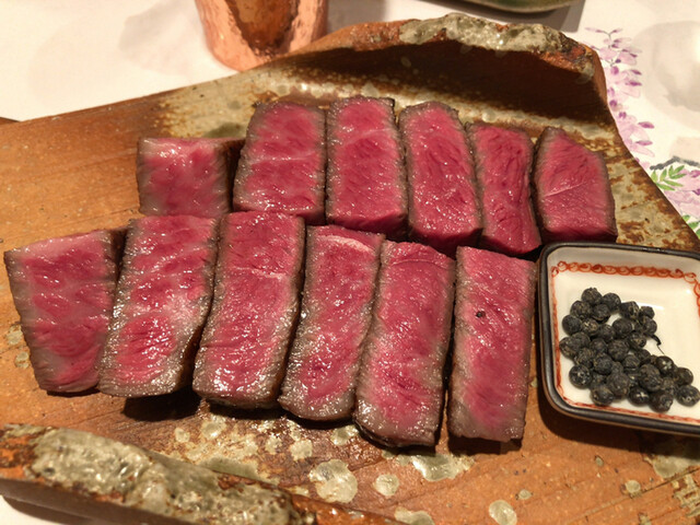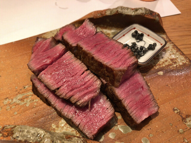 山形牛の雌シャトーブリアンステーキは、粒胡椒で仕上げられた香り高さにまずやられ、ひと口噛めば圧倒的な柔らかさとジューシーさ。