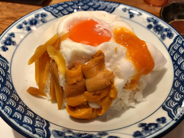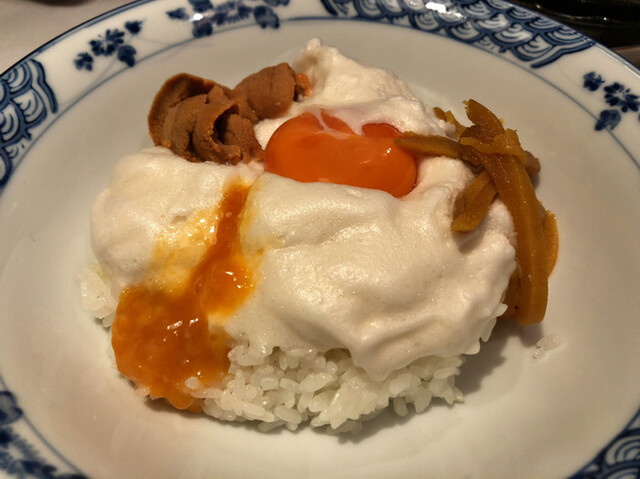 白身のふわふわメレンゲと濃厚な黄身、雲丹、からすみが三位一体となった唯一無二の一品。