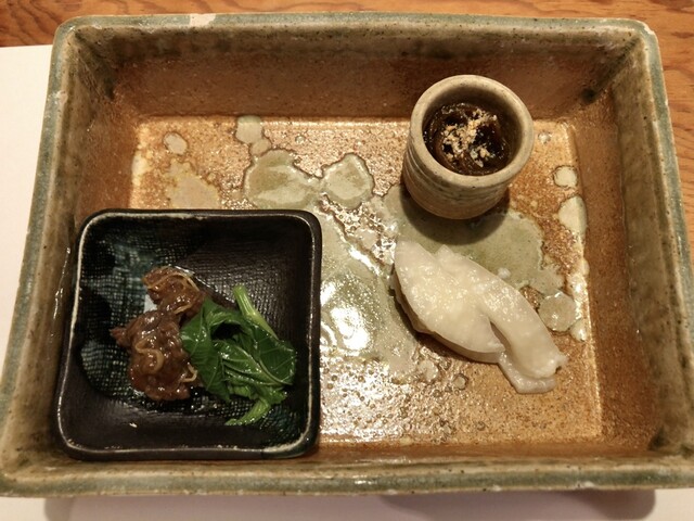 突き出し(淡路島 もずく、自家製蛍烏賊燻製、茶碗蒸し山葵ソース)