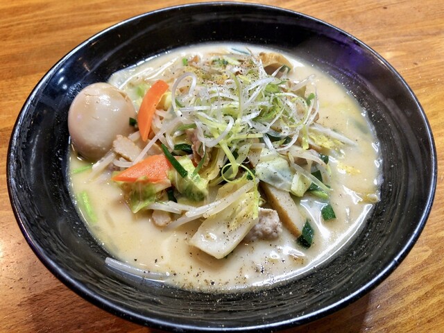 もやしやキャベツ、にんじんなどがしっかり盛られていて、白濁したスープの表面には旨味の層が広がる。