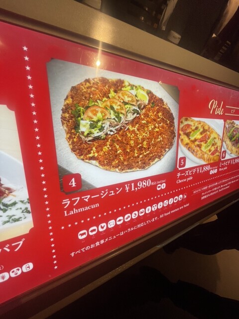 ラフマージュンというピザとお好み焼きの中間のような料理1980円とモチモチのトルコアイス600円をランチにいただきました。