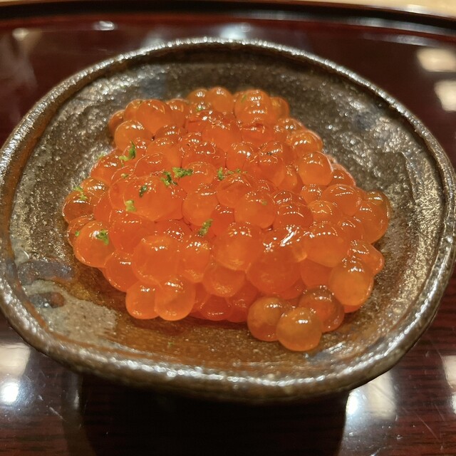 イカ、ズワイガニの茶碗蒸し上にたっぷり山わさびそして混ぜればイクラが。